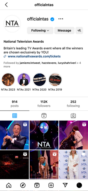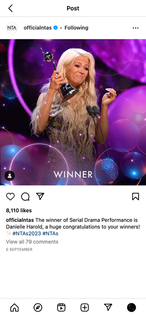 After having an initial meeting with the production team behind the NTAs, where we discussed everything from social assets and strategy to the order of events, Propeller got to work ahead of the event. Our Design team created the stylish, sleek frames used in all of the ‘Winner’ and ‘nominee’ posts on Instagram. We worked with the team at the NTAs to ensure they were on brand and fit in with the event.